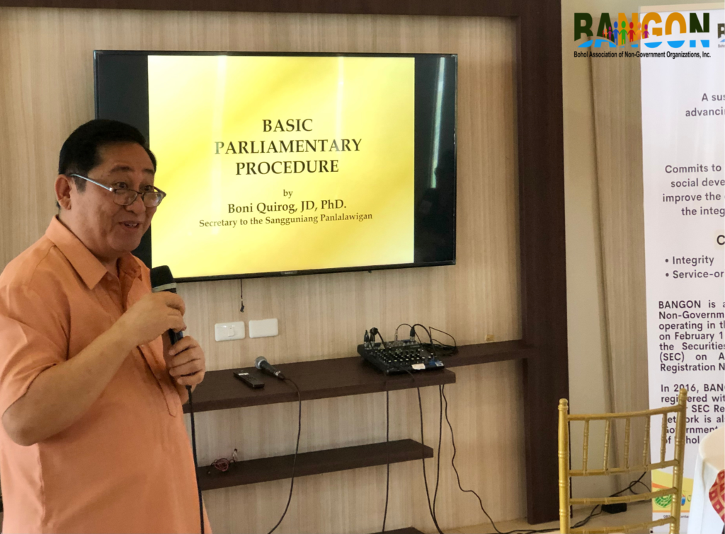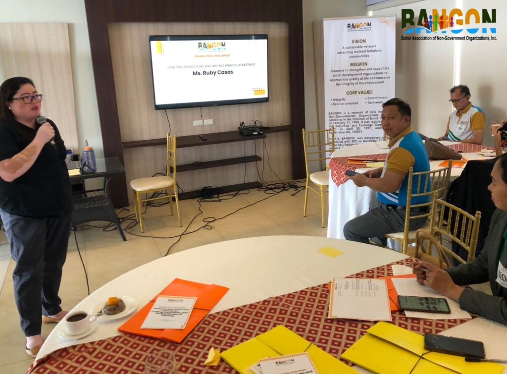 The event began with a welcome address by Francis Bernard I. Batoy, President of the BANGON Board of Trustees, who emphasized the importance of strong internal systems and the value of continuous learning for organizational sustainability and staff development. The training featured Mr. Bonifacio M. Quirog Jr., J.D., Ph.D., Secretary to the Sangguniang Panlalawigan of Bohol, as the speaker on Basic Parliamentary Rules and Procedures. Ms. Ruby C. Casas, Assistant Department Head of the Tagbilaran City General Services Office, led the session on Minutes Writing and Resolution Crafting.